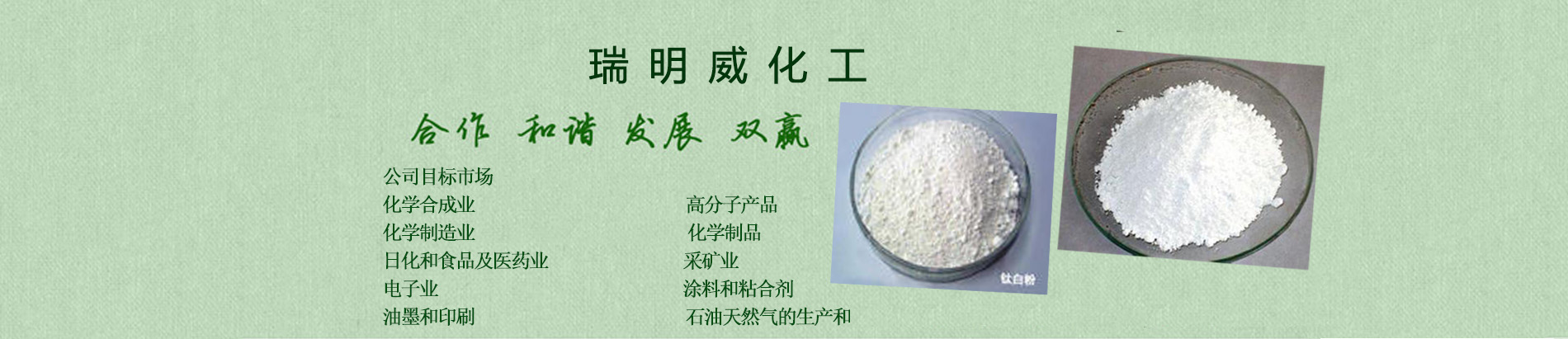 天津市瑞明威化工有限公司公司概況公司本著“興業(yè)、興人、興社會(huì)”的三興企業(yè)文化在業(yè)內(nèi)有著崇高的聲譽(yù)產(chǎn)品覆蓋面大,銷售輻射華東、華南、華北數(shù)百種產(chǎn)品,多種銷售模式可供選擇華東、華北、沿海、沿江長期包租有儲罐和倉庫提供個(gè)性化的完全服務(wù),解決用戶在化學(xué)品使用中的一切煩惱供應(yīng)鏈外包 個(gè)性化定裝與標(biāo)簽 來料加工業(yè)務(wù) 分包裝 化工超市 買方庫存管理公司目標(biāo)市場化學(xué)合成業(yè) 高分子產(chǎn)品化學(xué)制造業(yè) 化學(xué)制品日化和食品及藥業(yè) 采礦業(yè)電子業(yè) 涂料和粘合劑油墨和印刷 石油天然的生產(chǎn)和提煉